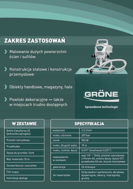 Gröne EasySpray20 to agregat malarski typu airless stworzony z myślą o sprawnym i estetycznym wykończeniu wnętrz i elewacji. Dzięki EasySpray 20 zyskujesz zybszą pracę niż tradycyjnym wałkiem – duże powierzchnie pokryjesz w mgnieniu oka